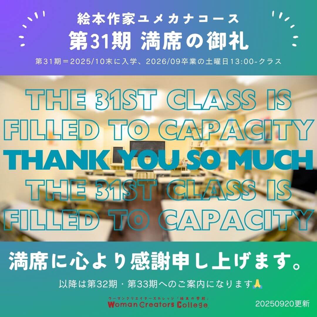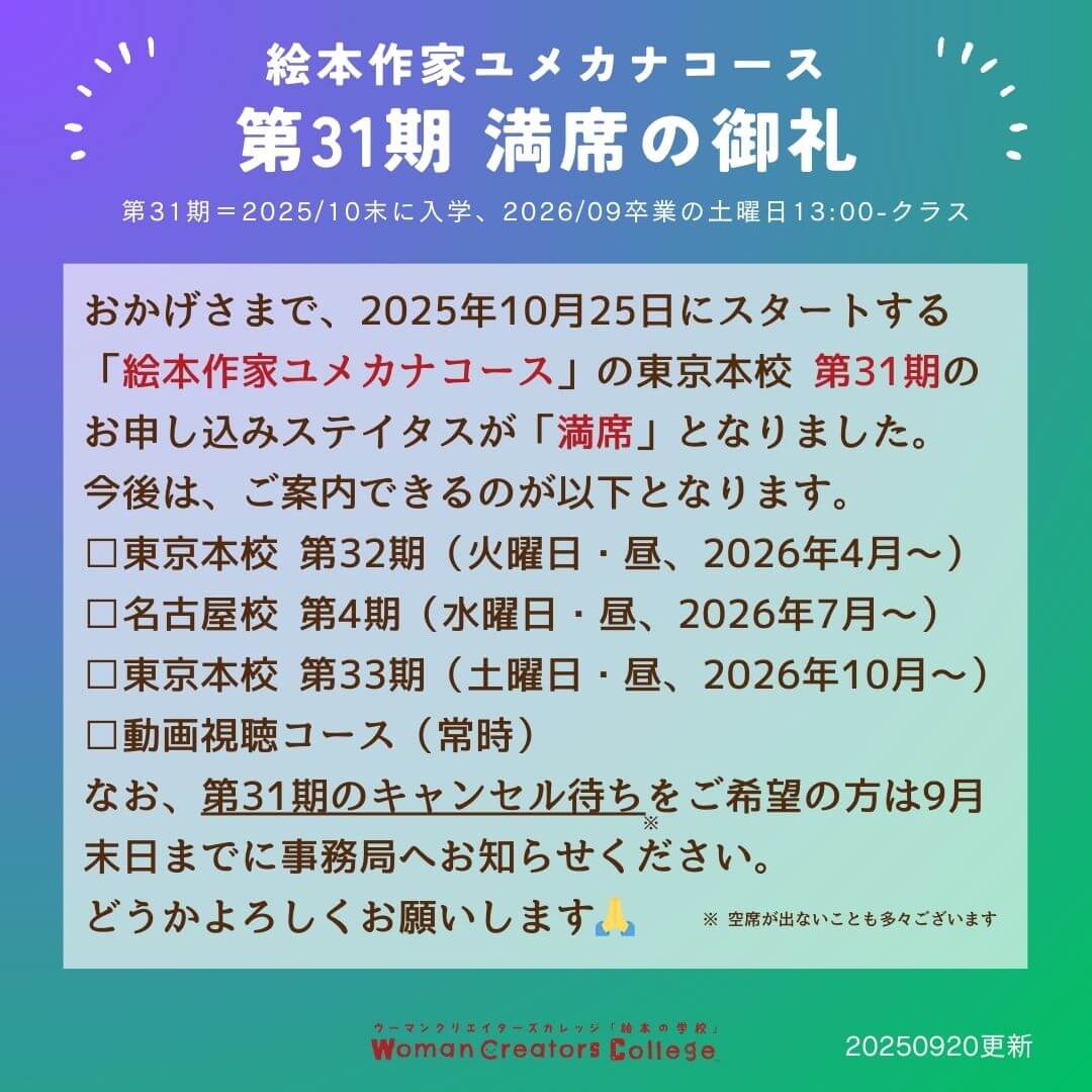 おかげさまで、2025年10月25日にスタートする「絵本作家ユメカナコース」の東京本校 第31期のお申し込みステイタスが「満席」となりました。